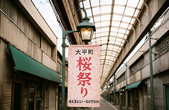 観光地や商店街を彩る街路灯に設置できる旗です。キャンペーン告知やイベント告知に役立ちます。