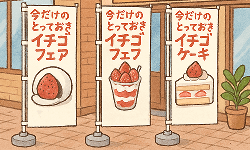 セールやイベントの情報に興味を持ってもらえる効果的なキャッチフレーズや、季節感を表すイラスト、食欲がわく鮮やかな写真等を添えて旗や幕をデザインしましょう!まずは見にしてもらうことが大事です!